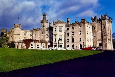 Le château en pierre présente de multiples tourelles, des éléments de style gothique et des meubles d'époque dans ses vastes salles et salons de réception.