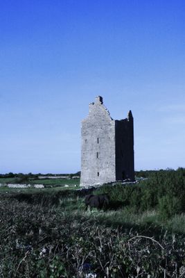 Drumharsna Castle est une tour de pierre de cinq étages dans le Comté de Galway avec des murs défensifs épais, des fenêtres étroites et deux cheminées conservées au niveau supérieur. La structure montre les caractéristiques typiques d'une maison-tour utilisée par les propriétaires anglo-normands en Irlande.