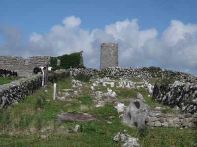 Le site porte le nom d'un saint des premiers temps et conserve encore les traces de pratiques religieuses médiévales comme les stations de pénitence marquées. Les visiteurs peuvent voir des pierres tombales et comment les bâtiments étaient arrangés pour servir à la fois de cimetière et de lieu de prière communautaire.