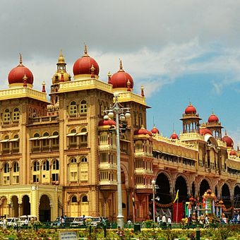 Mysore est une ville de l'État du Karnataka, en Inde. L'agglomération s'étend sur plusieurs quartiers autour du complexe palatial central, avec de larges avenues bordées d'arbres anciens et des parcs entre les quartiers résidentiels et commerciaux.