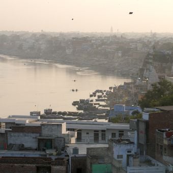 Varanasi est une ville de million d'habitants dans le district de Varanasi en Uttar Pradesh en Inde, située le long de la rive occidentale du fleuve Gange. Des plateformes en pierre à gradins descendent depuis la zone urbaine surélevée vers le bord de l'eau, où des ruelles étroites alternent avec des temples, des résidences et de petites boutiques.