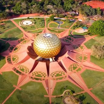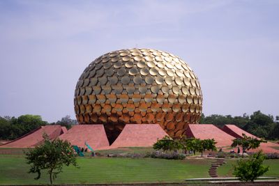 Le Matrimandir est une sphère dorée au centre d'Auroville couverte de disques de laiton réfléchissants qui brillent à la lumière du soleil. À l'intérieur, une chambre de méditation présente des murs en marbre blanc et une sphère de cristal qui reçoit la lumière par une ouverture au plafond.