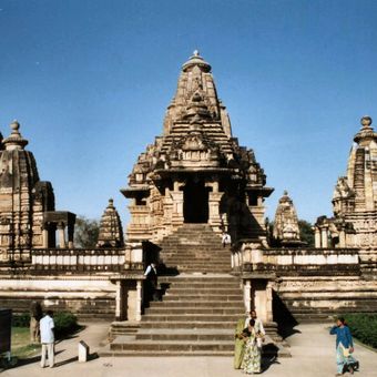Khajuraho est une ville du district de Chhatarpur, dans le Madhya Pradesh, reconnue pour ses édifices religieux en pierre datant de la période médiévale. La localité se trouve sur un plateau, où les groupes de temples sont séparés par des jardins et des espaces ouverts.