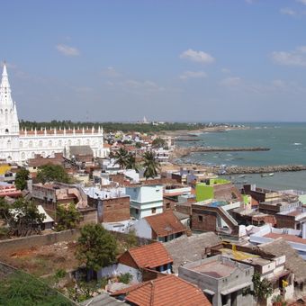 Cette agglomération côtière occupe la pointe sud du sous-continent indien, là où trois masses d'eau convergent sur un littoral rocheux. L'agglomération s'étend le long de la côte avec des plages de sable, des temples et des monuments répartis sur plusieurs kilomètres.