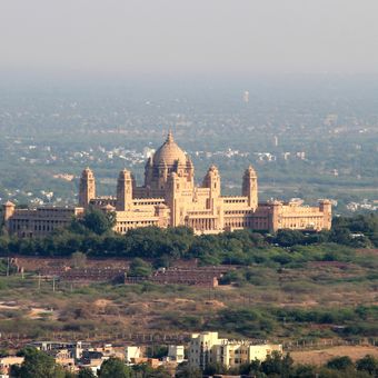 Le palais Umaid Bhawan est une structure en grès jaune comptant plus de 300 pièces, des coupoles et des colonnades au centre de Jodhpur. Les vastes jardins entourent le bâtiment principal avec des fontaines, des pelouses et des arbres d'ombre.