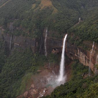 La cascade Nohkalikai chute de 340 mètres dans un bassin vert, ce qui en fait la plus haute cascade à chute unique de l'Inde.