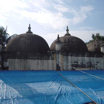 Cette mosquée du quinzième siècle présente trois dômes et illustre les éléments architecturaux de la période du Sultanat du Bengale près de la Route Nationale 17.