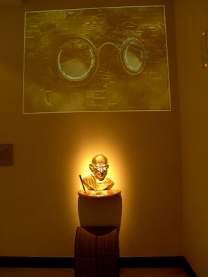 L'exposition présente des symboles indiens comme des rouets et des roues de prière représentant les valeurs et les enseignements de Gandhi. Les visitants découvrent aussi des courtepointes collaboratives qui incarnent ses messages d'unité.