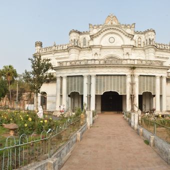 Le jardin du palais contient une fontaine centrale entourée de statues en marbre et de balustrades en fer décoratives face au fleuve Bhagirathi-Hooghly.