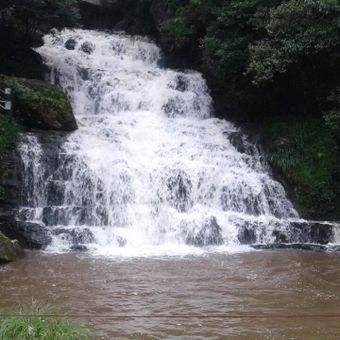Les Chutes de l'Éléphant à Shillong est une cascade à trois étages où l'eau tombe par étapes successives dans des bassins naturels. La végétation dense entoure le site, et l'étage final s'écoule sur des rochers pointus lors de sa descente.