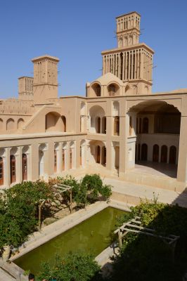 Les espaces intérieurs comprennent une salle nord en forme de croix donnant sur une cour centrale avec un grand bassin en pierre, suivant la conception résidentielle perse traditionnelle.
