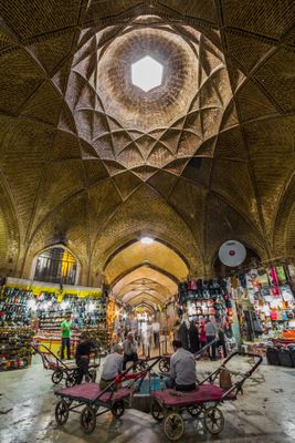 Le marché comprend des sections dédiées au tissage de tapis persans, à l'artisanat traditionnel et aux produits agricoles locaux, représentant les traditions commerciales régionales.