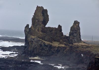 Lóndrangar est composé de deux piliers de basalte qui s'élèvent depuis l'océan sur la côte de la péninsule de Snæfellsnes, le plus haut atteignant 75 mètres et le plus court 61 mètres. Ces formations sont les restes d'une activité volcanique ancienne, façonnées au fil des millénaires par l'érosion marine et les intempéries.