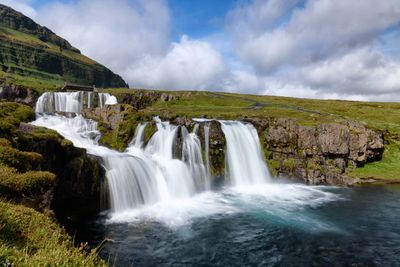 Kirkjufellsfossar est une cascade a trois niveaux pres du Mont Kirkjufell dans la region occidentale de l'Islande. L'eau descend environ 16 metres en trois cascades distinctes vers la riviere Kirkjufellsa.