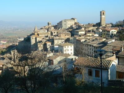 Anghiari est une ville médiévale perchée à environ 429 mètres d'altitude, entourée de robustes murs de pierre construits au 13e siècle. L'établissement surplombe la vallée du Tibre avec des ruelles étroites, des bâtiments en pierre et des points de vue sur le paysage environnant.