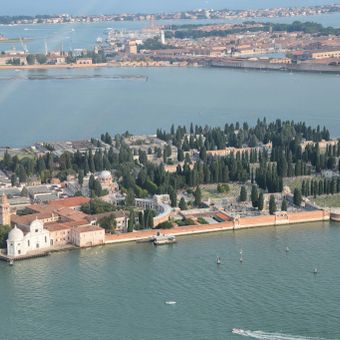 San Michele est une île cimetière dans la lagune de Venise qui accueille les défunts de la ville depuis des siècles. L'île est caractérisée par des rangées de tombes sous les cyprès, une église Renaissance au centre et des sentiers organisés reliant les différentes sections.