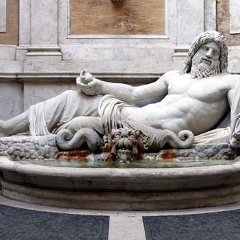 Marforio est une sculpture en marbre blanc dans la cour du Palazzo Nuovo représentant un dieu barbu allongé tenant une coquille à la main. La figure représente probablement Océanus ou une divinité fluviale et a été sculptée en pierre pendant la période impériale romaine précoce.