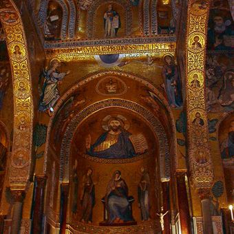 La Cappella Palatina est une chapelle à deux niveaux à l'intérieur du Palazzo dei Normanni à Palerme, dont les murs et les voûtes sont presque entièrement recouverts de mosaïques dorées. La salle supérieure est soutenue par des colonnes élancées qui forment une basilique à trois nefs, tandis qu'un plafond en bois aux sculptures géométriques flotte au-dessus de la nef centrale.