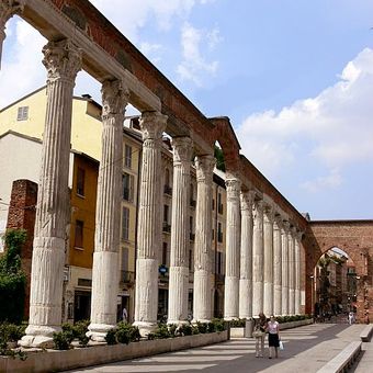 Les Colonne di San Lorenzo constituent un portique romain antique du 2e siècle avec seize colonnes corinthiennes en marbre aux chapiteaux décorés. La structure se tient devant la Basilique San Lorenzo et forme une partie distinctive de la place où les gens circulent.