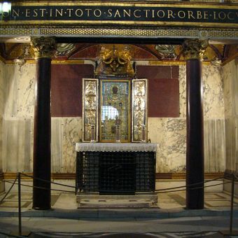 Le Sancta Sanctorum est une petite chapelle privée du Palais du Latran ornée de précieux sols en mosaïque de marbre du 13e siècle et de peintures murales médiévales. L'intérieur affiche une décoration élaborée partout en utilisant une technique qui combine le marbre et la pierre en motifs géométriques.