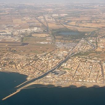 Portus est un complexe portuaire antique près de Rome construit autour d'un bassin hexagonal qui reste visible aujourd'hui sous forme de plan d'eau. Le site s'étend sur un terrain dégagé et comprend des fondations d'entrepôts, de canaux et de bâtiments publics dispersés sur une vaste zone.