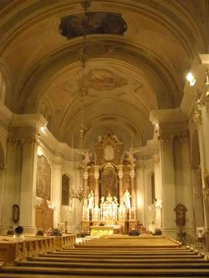 L'autel principal, construit en 1773 par Johann Müssack Jr, présente des figures en bois de Saint Pierre et Saint Paul décorées de stuc.