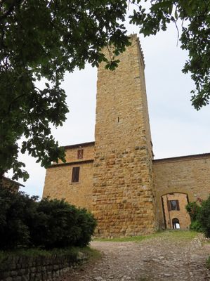 Le château de Contignaco se dresse sur une colline près de Salsomaggiore Terme, présentant des murs de pierre médiévaux et une tour prominente qui s'élève au-dessus du paysage environnant. La forteresse conserve sa structure défensive d'origine avec des murs épais construits pour se protéger contre les attaques.