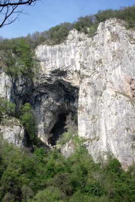 L'entrée de la grotte mesure 45 mètres de hauteur et 38 mètres de largeur, avec des formations calcaires naturelles sculptées par l'érosion.