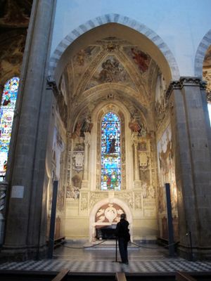 La chapelle présente des cycles de fresques représentant les histoires de Saint Philippe et Saint Jean l'Évangéliste sur les murs latéraux.