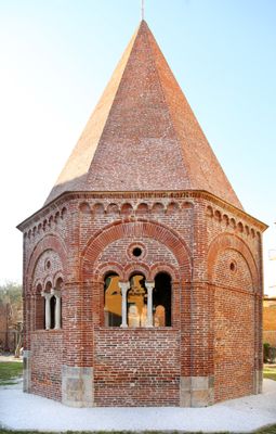 La structure octogonale en briques présente des fenêtres trilobées avec colonnes en marbre, arcs décoratifs et un toit pointu dominant les environs.