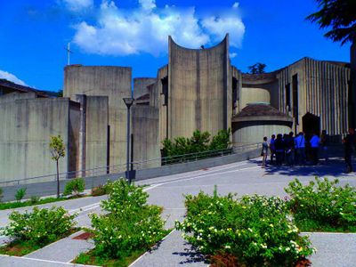 L'église Sacra Famiglia est un bâtiment religieux situé dans le quartier de Fratte, construit à partir de six dômes de béton imbriqués qui forment sa structure principale. L'intérieur est organisé en sections circulaires qui se connectent les unes aux autres, l'ensemble du design reposant sur le béton armé comme matériau principal.