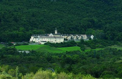 La Chartreuse de Vedana s'élève à 430 mètres sur les pentes du Piz di Vedana, avec un cloître central entouré de cellules monastiques.