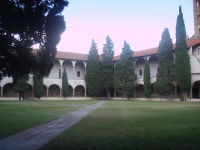 Le cloitre a ete construit au milieu du 14e siecle comme partie du monastere, et plus tard il a ete redesigne au 16e siecle par l'architecte Giulio Parigi. Cette renovation a ete commandee par une famille puissante et a donne a l'espace son apparence actuelle.