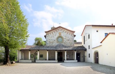 Le couvent en pierre se dresse parmi les arbres dans la campagne du Mugello, avec une cour centrale et des cellules monastiques disposées autour.