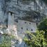 Le monastère en pierre se dresse contre la paroi rocheuse du Colle San Marco, intégrant des formations naturelles de grottes dans sa construction en blocs de travertin.