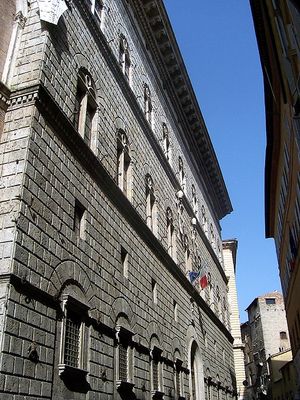 Le Palazzo Piccolomini est un palais Renaissance a Sienne avec une facade de trois etages en pierre taillee. Le batiment possede des fenetres arrondies encadrees de pierre sculptee et les armoiries de la famille Piccolomini sur son cote principal.