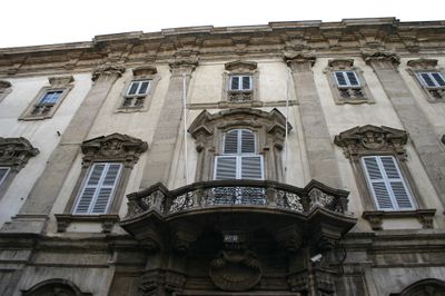 Palazzo Cusani est un palais baroque situé Via Brera à Milan, avec une facade ornée de cadres de fenêtres élaborés et de balcons proéminents. Le bâtiment s'étend sur plusieurs étages et affiche des détails architecturaux baroques tardifs, avec de grandes pièces et des plafonds décorés à l'intérieur.