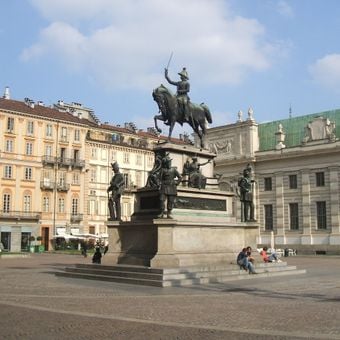 La place présente une statue équestre monumentale de Carlo Alberto face au Palazzo Carignano, avec quatre soldats et figures féminines.