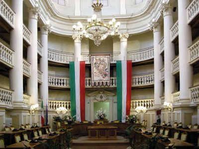 L'ingénieur Ludovico Bolognini a conçu cet espace en 1774 à l'origine comme archive ducale. Sa transformation ultérieure en salle d'assemblée en a fait le berceau du drapeau national italien.