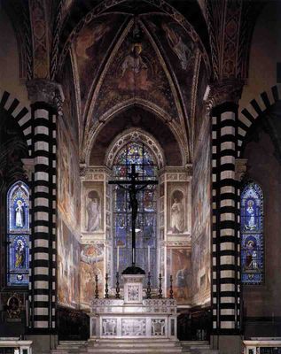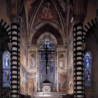 Les murs de la Cappella Maggiore présentent des scènes détaillées de la vie de Saint Étienne et Saint Jean-Baptiste à travers différents épisodes.