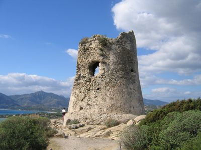 Torre di Porto Giunco est une structure en pierre situee sur le Cap Carbonara qui domine la cote sud de la Sardaigne. Elle a ete construite entierement en granit local et se dresse sur un terrain sureleve avec des vues sur la mer environnante.
