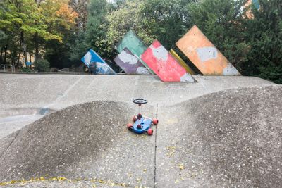 Le Giardino del Guasto est un jardin public à Bologne construit sur un terrain surélevé avec des chemins en béton, une zone pavée centrale et une fontaine qui s'écoule sur une surface de ciment. La disposition crée différents niveaux qui suivent les contours de l'ancien site du palais, donnant à l'espace un caractère physique distinctif.