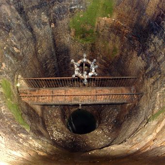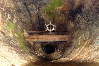 La cavité cylindrique atteint 37 mètres de profondeur avec un diamètre de 5,6 mètres, comprenant un système complexe d'escaliers en pierre.