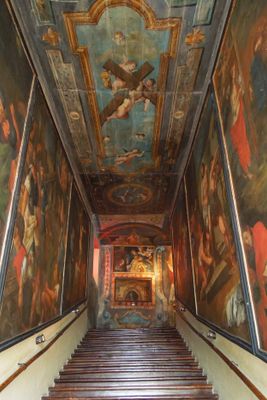 Le plafond au-dessus des marches affiche des peintures detaillees d'anges et de symboles de la Passion qui accompagnent l'ascension. Des reliquaires napolitains places dans toute la chapelle contiennent des fragments de la Vraie Croix, approfondissant le poids spirituel du lieu.
