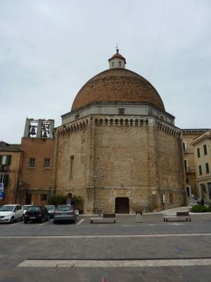 La position surélevée de la cathédrale sur une colline permet aux visiteurs d'apercevoir la mer Adriatique et les montagnes du Gran Sasso.