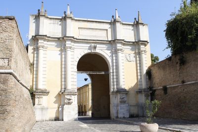 La porte fut construite en 1583 après la démolition de la Porta Aurea, intégrant des blocs de pierre et des éléments architecturaux de la structure romaine précédente.