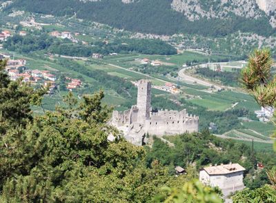 Castello di Drena est une ruine de château avec une tour centrale et des murs défensifs doubles sur un terrain surélevé. Les bâtiments affichent des éléments architecturaux romans et gothiques, tandis que la situation en hauteur offre des vues sur la vallée de la Sarca.