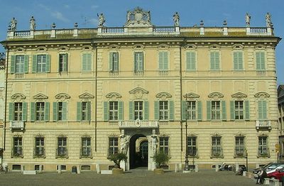 Le Palazzo Bianchi présente une façade en pierre avec des fenêtres symétriques et des éléments décoratifs caractéristiques de l'architecture du nord de l'Italie.