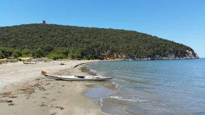 La plage s'étend dans une crique protégée du Parc Naturel de Maremma, présentant un sable doré bordé de végétation méditerranéenne et des eaux limpides.