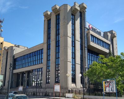 Ex palazzo della Banca Popolare di Pescopagano, Bâtiment bancaire postmoderne à Pescopagano, Italie.